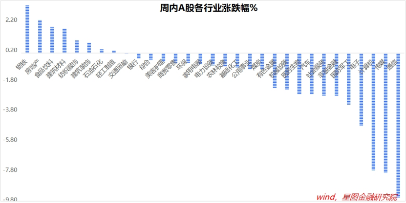 一周来看,上证指数下跌1.72%,收于3320.90点。主要宽基指数以下跌为主,万得全A涨幅-2.53%;中证A50、沪深300、中证500、中证1000和中证2000涨幅分别为-2.07、-2.22%、-3.26%、-2.77%和-2.86%。红利指数逆势收涨0.22%。