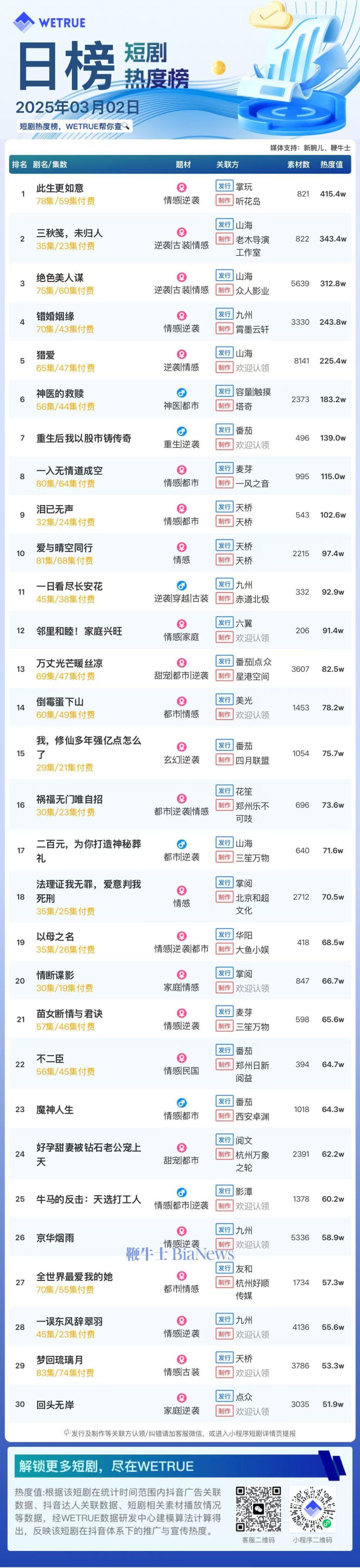编者按:为帮助短剧从业者提供更多信息,专注于短剧报道的新腕儿和科技媒体鞭牛士联合WETRUE短剧热度榜共同推出短剧热度榜。