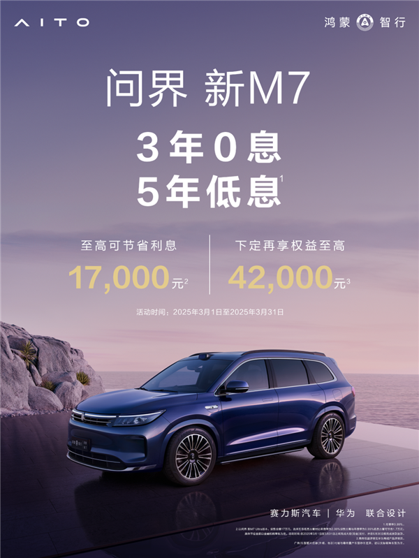 快科技3月3日消息,AITO汽车宣布,鸿蒙智行问界新M7新增3年0息、5年低息限时金融政策!
