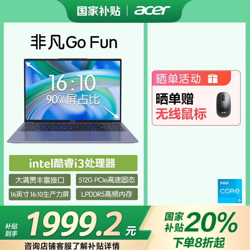宏碁非凡Go Fun轻薄本学生办公16英寸笔记本电脑