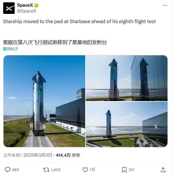 3 月 3 日消息,今日一早,SpaceX 宣布星舰二级 S34 已运抵发射场,第八次飞行测试的发射窗口期将于北京时间 3 月 4 日早上 7:30(美国中部时间 3 月 3 日下午 5:30)开启。