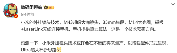 【CNMO科技消息】近日,CNMO注意到,数码闲聊站发文表示:“小米的外挂镜头技术,M43超级大底镜头,35mm焦段,f/1.4大光圈,磁吸+LaserLink无线连接手机,手机提供算力算法,这是一个技术预研方向。预测一下,小米外挂镜头技术或许会在不远的将来量产,以增强配件形式呈现,Ultra超大杯新思路。”