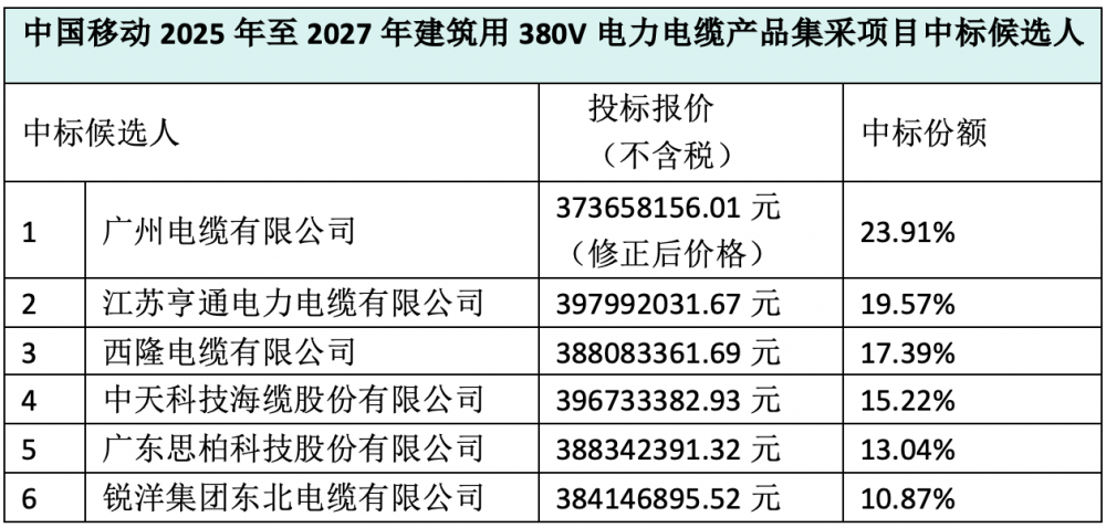C114讯 3月3日消息(九九)中国移动采购与招标网日前发布2025年至2027年建筑用380V电力电缆产品集中采购项目中标候选人公示,广州电缆有限公司等6厂商中标,中标候选人的投标报价(不含税)均在4亿元以内。