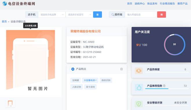 3 月 3 日消息,型号为 NIC-AN00 的荣耀新机已现身电信设备终端网,新机暂未公布外观信息,但支持 5G 网络、指纹识别、人脸识别、双卡双待等功能。
