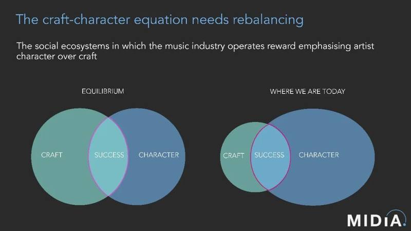 根据Midia报告的分析,在理想状态下,技艺(Craft)与个性(Character)呈现出相对平衡的态势,二者存在交集,而成功(Success)则处于这一交集区域内。因此,精湛的音乐技艺与吸引人的个性特质,共同推动了艺术家的成功。