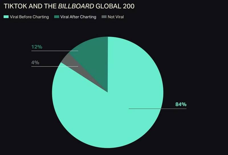 另外,TikTok 2024年第二份年度《音乐影响报告》中显示,84%登上Billboard Global 200榜单的歌曲都率先在TikTok上走红,另有12%的歌曲在登榜后开始在TikTok上走红,只有4%的歌曲没有在TikTok经历过病毒式传播。