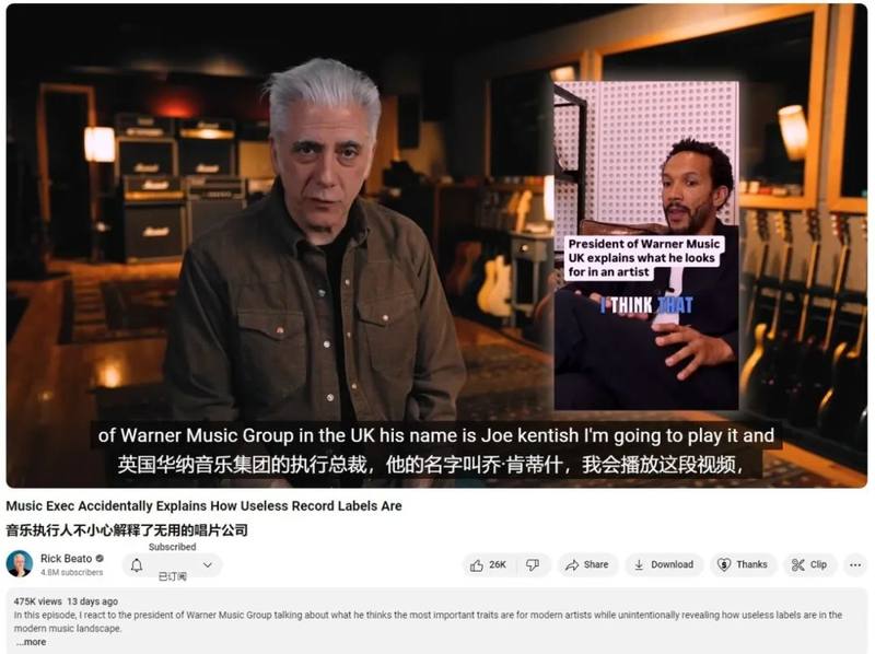 近日,美国知名制作人Rick Beato在YouTube发布了一个吐槽华纳音乐执行总裁Joe Kentish的视频,标题为“唱片公司高管无意中暴露了他们的无能”,引发热议。