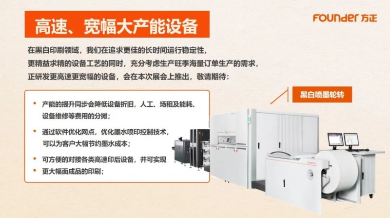 在黑白印刷领域,即将推出的新款高速、宽幅、大产能喷墨设备,不仅能保证更长时间的稳定运行,大幅度提升生产效率,还将大幅度节省墨水成本。其强大的兼容性能与各类高速印后设备无缝对接,实现更大幅面成品的快速印刷。