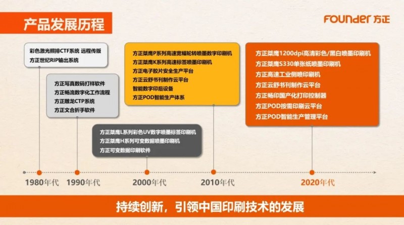作为中国知名的高端数字喷墨技术提供商,方正印捷从2005年开始进行喷墨印刷技术的可行性研究,面对层出不穷的新技术,如互联网、物联网、大数据等对传统印刷业的冲击,在按需印刷、智能包装等领域重点耕耘,已形成了完整的系列产品和印刷解决方案,并得到了市场认可。方正高速喷墨数码印刷设备在国内的市场占有率长期保持在50%以上。