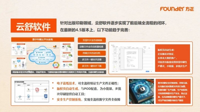 以“文件流转与管理”为核心的出版流程再造是近几年出版行业最火热的数字化项目。针对出版生产流程智能化创新,方正印捷推出了云舒书刊制作云平台,已成为出版行业认可度极高的数字出版流程软件。