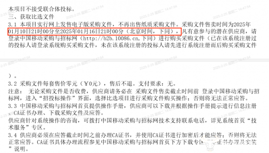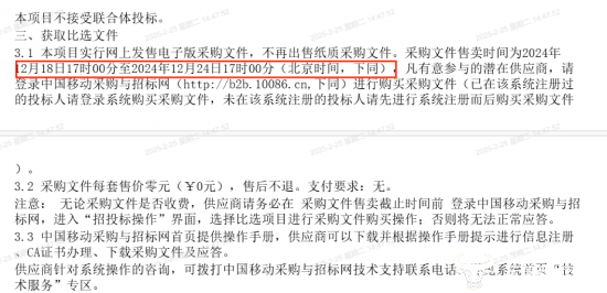 就在第一次比选公告发布不到一个月后,移动该神功公司第二次发布比选公告。运营商财经网经对比发现,两个公告在采购内容和价格等方面并没有出入,但是采购文件售卖时间出现了变化。