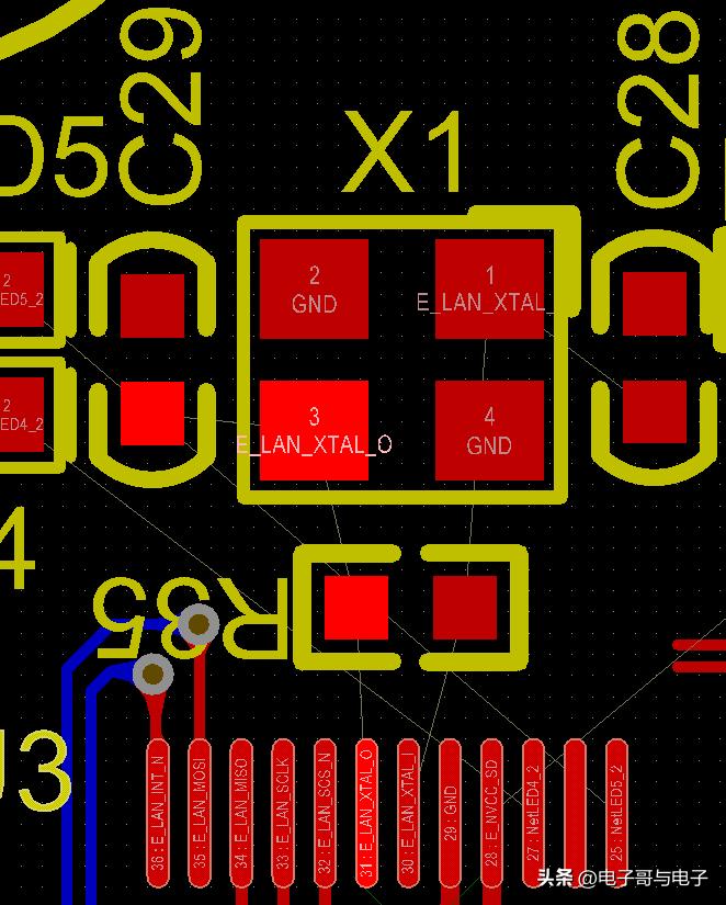 晶振需要放在CPU附近,离CPU的晶振引脚要近。如果是无源晶振,2个匹配电容要靠近晶振。晶振走线要短及加粗,晶振下面尽量不要走其它信号线。