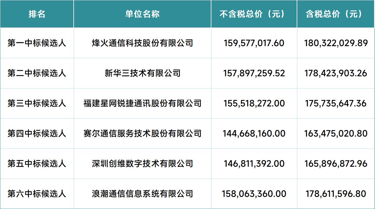经评审,烽火通信科技股份有限公司综合排名第一;新华三技术有限公司综合排名第二;福建星网锐捷通讯股份有限公司综合排名第三;赛尔通信服务技术股份有限公司综合排名第四;深圳创维数字技术有限公司综合排名第五;浪潮通信信息系统有限公司综合排名第六。