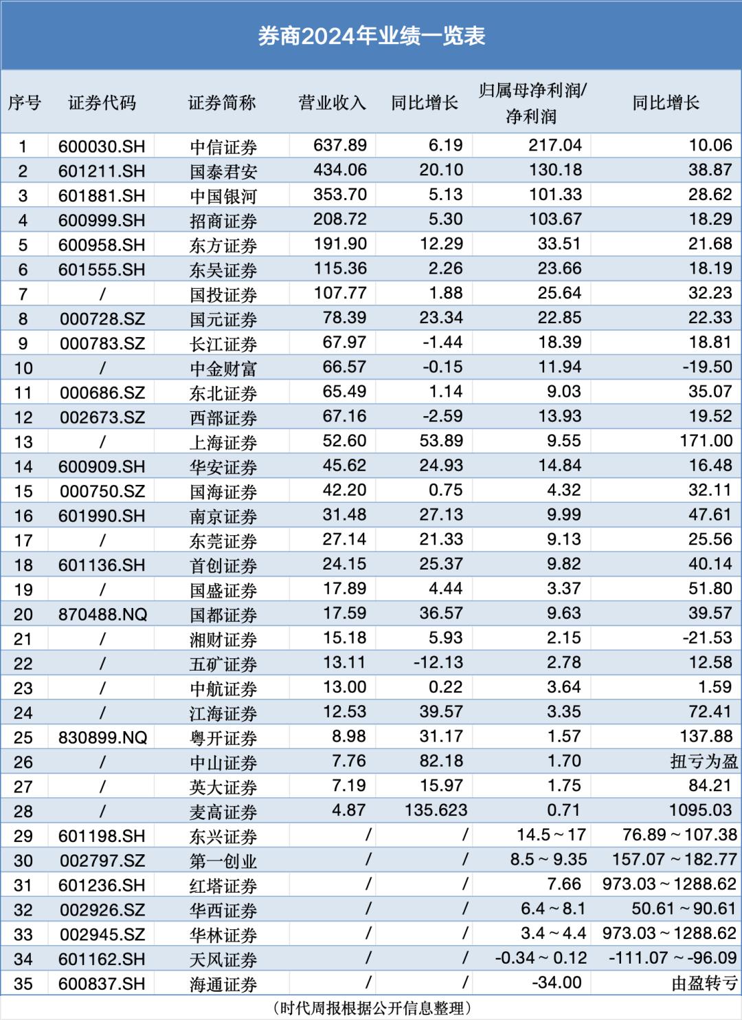 经历了去年的“924”行情后,券商业绩整体回暖。根据时代周报记者统计,截至2月28日,已有35家券商发布业绩。不同于2024上半年的“颓势”,多家券商在下半年迎来业绩爆发。从2024全年来看,35家券商有31家净利润上升,其中1家扭亏为盈,仅有4家净利润下滑。近九成券商报喜,一扫去年上半年证券业的“阴霾”,为行业打入一针强心剂。自“924”以来,市场交投活跃度明显改善。根据时代周报记者统计,11家券商经纪业务收入上涨,无论是已有30亿经纪业务体量的国投证券,抑或是前一年尚未过亿的麦高证券,均迎来不同程度的增长。过去的2024年,受市场环境及自身发展影响,多家券商出现股权结构调整、核心高管变动。这意味着,2024年的业绩,是券商在复杂的外部环境和内部改革调整的双重压力下交出的答卷。01 国泰君安净利增近4成,中国银河重回百亿在市场交投热度回升之时,头部券商尽显实力。营收规模在百亿以上的7家券商,2024年全部实现净利润增长超过10%。整体来看,头部券商通过规模优势和综合业务能力保持领先,业绩稳中有进。券业“一哥”中信证券(600030.SH)仍然稳居第一,其归母净利润为217.04亿元,同比增长超过一成,将第二名国泰君安(601211.SH)拉开87亿元的差距。此外,净利润规模百亿以上的还有国泰君安、中国银河(601881.SH)、招商证券(600999.SH)。其中,国泰君安归母净利润为130.18亿元,同比增长接近4成;中国银河归母净利润为101.33亿元,同比增长接近3成;招商证券归母净利润为103.67亿元,同比增长接近2成。值得注意的是,中信证券净利润重回两百亿规模,中国银河重回一百亿规模,二者均回到2021年的巅峰水平,对头部券商整体而言意义重大。国投资本(600061.SH)旗下国投证券归母净利润为25.64亿元,增长超过3成;东方证券(600958.SH)归母净利润为33.51亿元,东吴证券(601555.SH)为23.66亿元,二者增长接近或者超过2成。不过,国投证券在2021年(彼时为安信证券)的净利润为40亿左右,东方证券为50亿左右,两家券商相比巅峰时刻仍有不少差距。2023年底,安信证券跟随国投资本正式更名为“国投证券”,旗下子公司及产品也同步更名,全面“去安信化”,因此2024业绩为公司更名后交出的首份成绩单。彼时国投资本表示,更名是基于国投证券战略定位、品牌规划、自身发展的需要,未来将强化股东赋能和产融协同,努力打造成为国投特色的“金融品牌名片”。除稳健的头部券商外,也不乏中小券商增长亮眼。上海证券在其2025年度融资券发行说明中披露,2024全年营收52.6亿元,同比大增53.89%,为公司自成立以来达到的最高营收规模;归母净利润达到9.55亿元,同比大增171.00%。此外,根据时代周报记者统计,新三板券商粤开证券(830899.NQ)利润增长翻倍、国盛证券增长超5成、英大证券增长超8成、江海证券增长超7成。