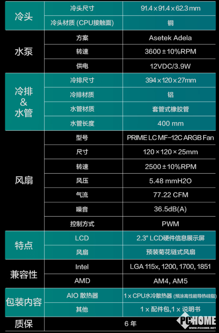 该款一体水搭配PRIME LC MF-12C ARGB高性能积木冷排风扇,支持菊花链拼接设计,预安装的设计优化了用户的PC DIY体验。其转速为600±2500 RPM,最大风量为77.22 CFM,最大风压为5.48 mmH2O,噪音值为36.5 dB(A),支持Aura RGB灯效。新产品支持英特尔LGA 115x/1200/1700/1851平台,以及AMD的AM4/5平台,可以满足用户对现有主流平台的使用需求。