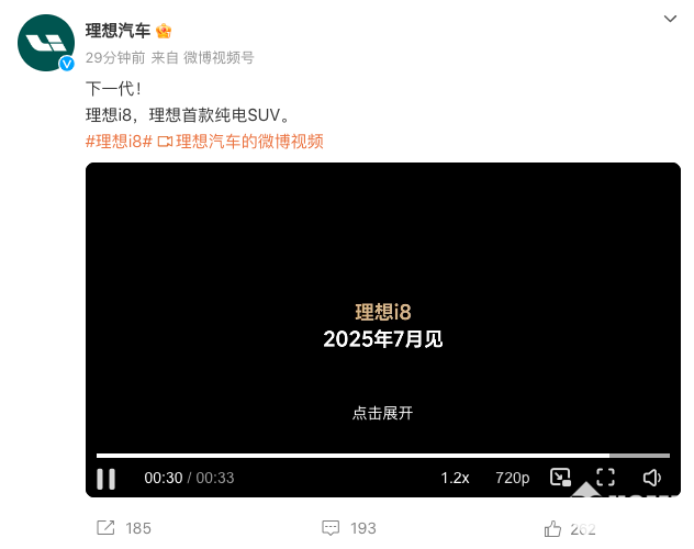 理想汽车官微发布消息称,理想首款纯电SUV理想i8将于2025年7月见,宣传口号为“下一代!”