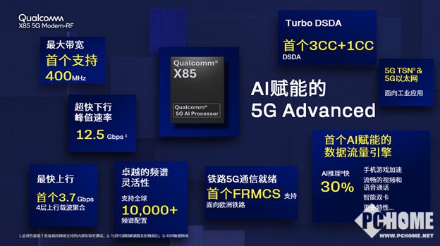 高通X85不仅具备强大的AI能力,还具备多项领先特性,包括支持超过10,000种载波聚合配置、卫星通信、先进的1024 QAM调制方式以及其它特性。这些让高通X85成为了业界标杆。