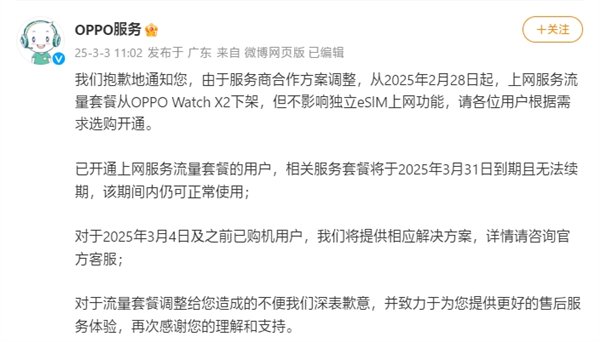 快科技3月3日消息,OPPO服务官微今天发布公告称,由于服务商合作方案调整,从2025年2月28日起,上网服务流量套餐从OPPO Watch X2下架。