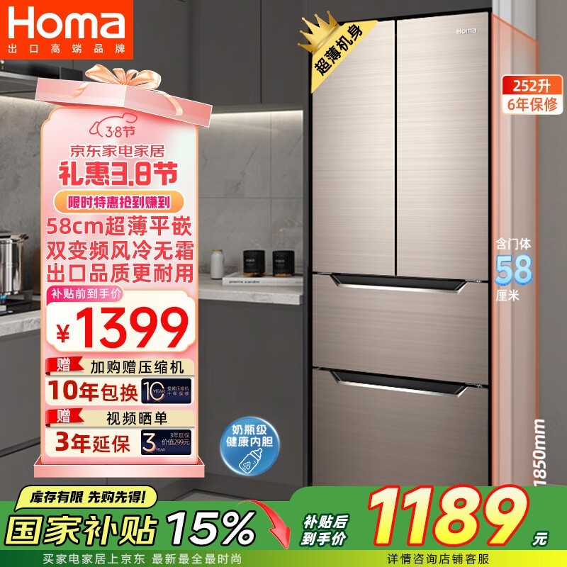 奥马冰箱BCD-252WF/B风冷多门冰箱1359元包邮