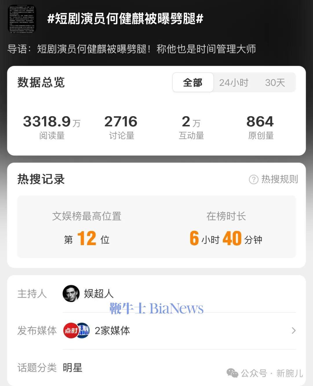 一则短剧演员何健麒被曝劈腿的新闻登上了微博娱乐榜第12名,阅读量超过3300万。