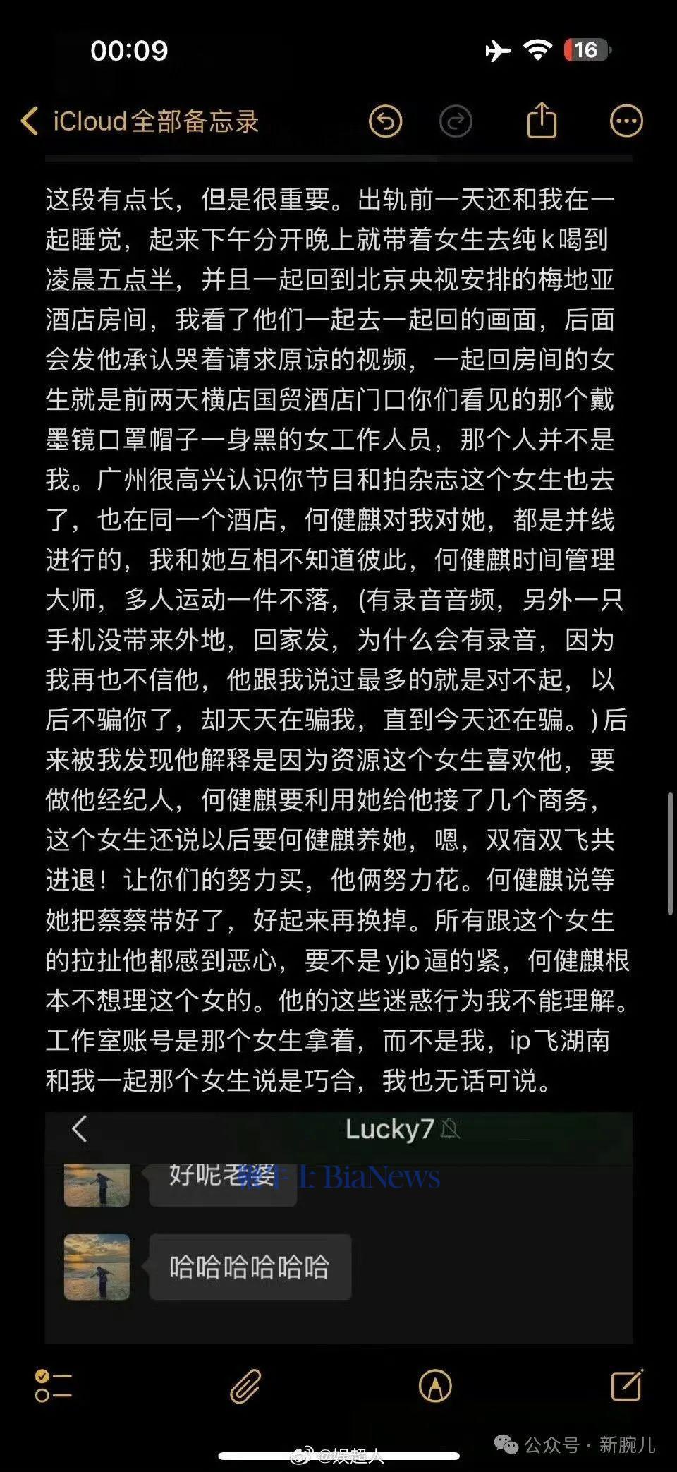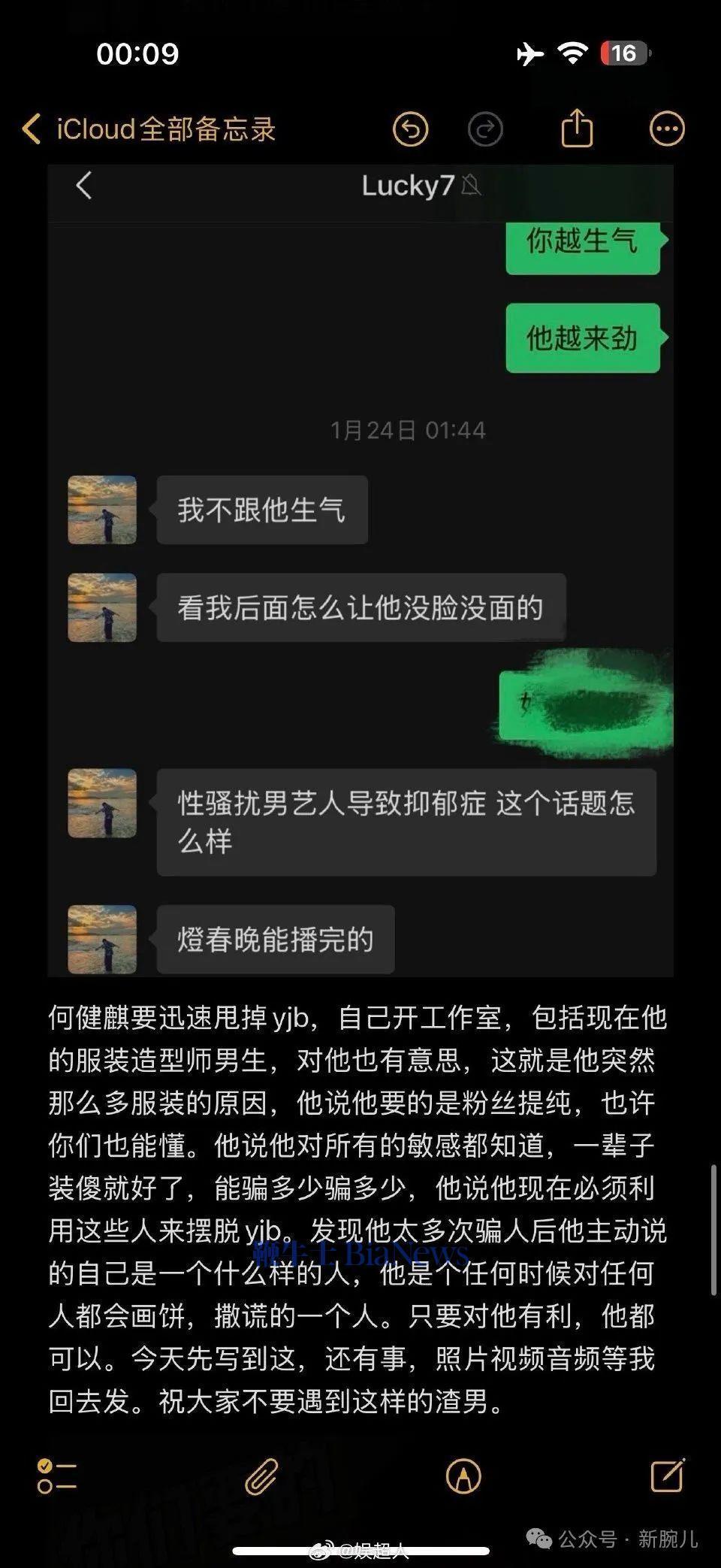 2025年3月,一名自称其“榜一大姐”的女性指控他恋爱期间劈腿、欺骗感情,并晒出15万元打赏记录及亲密照片。爆料称其“双线并行”与多人保持关系,事发后态度强硬。目前何健麒及其工作室尚未正式回应,但部分粉丝认为私生活与作品应分开看待。