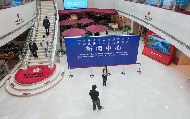 ▲2月27日,媒体记者和工作人员在全国两会新闻中心忙碌。在2025年全国两会即将召开之际,设在北京梅地亚中心的全国两会新闻中心2月27日正式启用。图/新华社