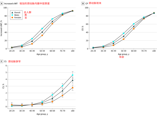 来自参考文献[1]:按地区标准化的颈动脉内膜中层厚度 (cIMT)、颈动脉斑块 (CP) 和颈动脉狭窄 (CS) 增加的年龄和性别患病率