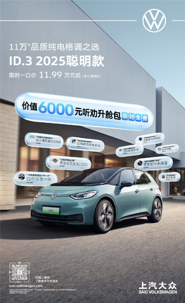 快科技3月3日消息,大众ID.3 2025聪明款正式上市,推出3款车型,限时一口价区间为11.9888万至13.6888万元。