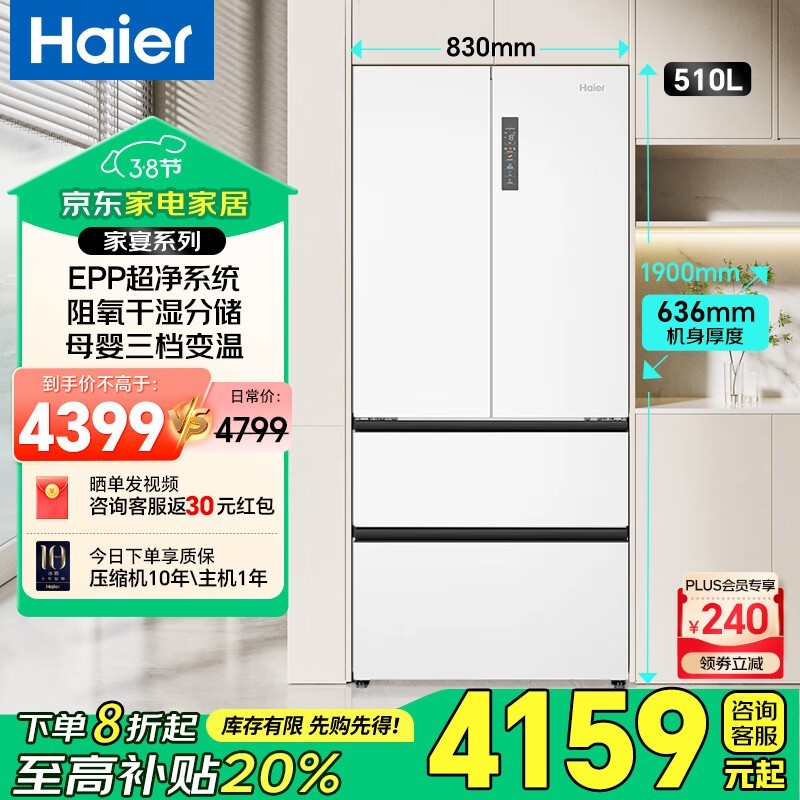 海尔510升法式多门冰箱,大容量静音节能,仅3599元