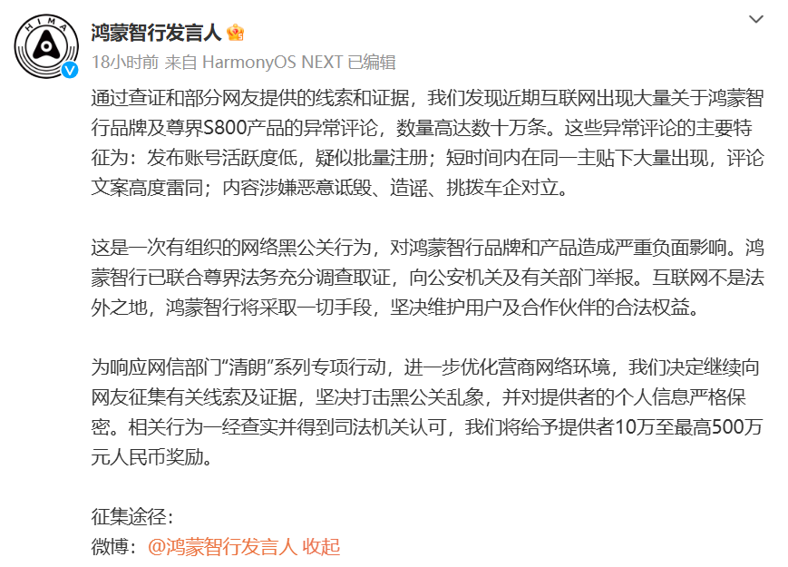 事实上,鸿蒙智行并非唯一受害者。近年来,不少车企也公开表示遭遇黑公关攻击,且手法高度相似——集中注册账号、雷同文案、挑拨对立。这反映出智能汽车行业存在两大痼疾:一是部分企业将舆论战视为“常规操作”,二是流量红利催生畸形竞争心态。