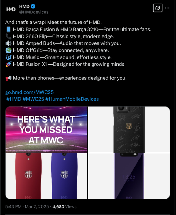 【CNMO科技消息】3月3日,在MWC 2025大会上,智能手机制造商HMD推出了一系列新品,涵盖智能手机、功能手机、耳机和卫星标签等多个领域。