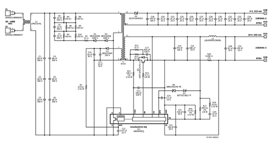 InnoSwitch3-AQ采用反激式变换器,可从高压输入提供两个隔离的低压输出。以设计范例中的电源为例,能实现30 V DC – 1000V DC输入,输出18V/555mA和9V/333mA的稳定电压,满足汽车不同部件的供电需求,如牵引逆变器门极驱动或应急电源等。
