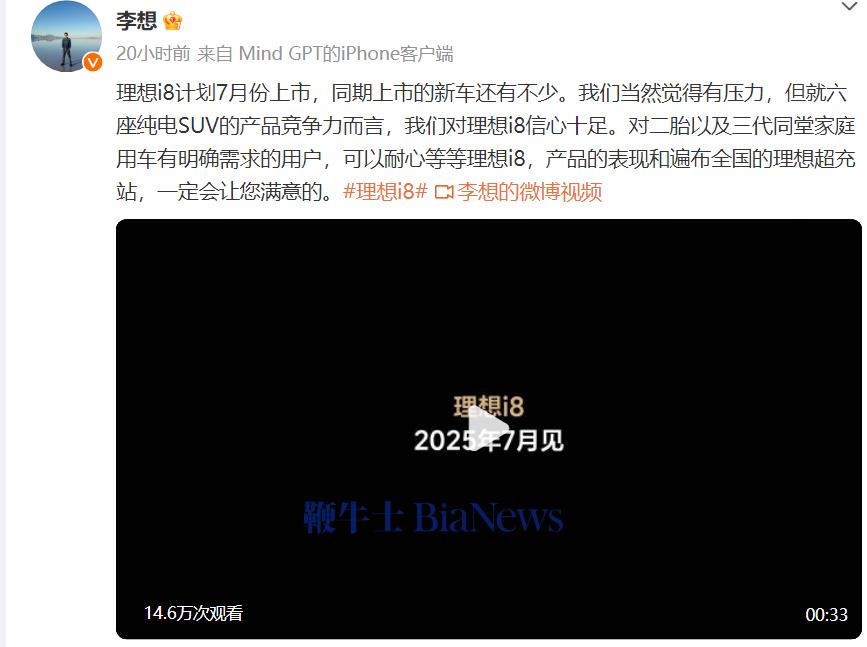 鞭牛士 3月4日消息,理想汽车董事长兼CEO李想昨日发文表示:“理想i8计划7月份上市,同期上市的新车还有不少。我们当然觉得有压力,但就六座纯电SUV的产品竞争力而言,我们对理想i8信心十足。”