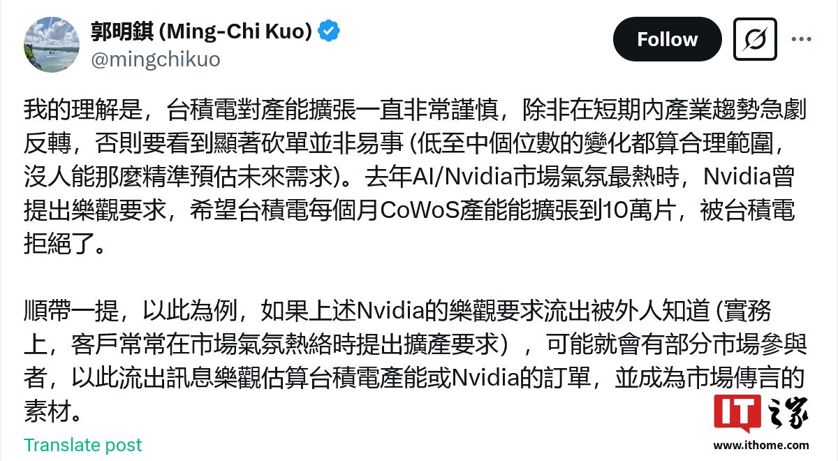 IT之家另悉,郭明錤认为台积电在产能扩张一事上一直“非常谨慎”,一般不会出现显著砍单的情况。