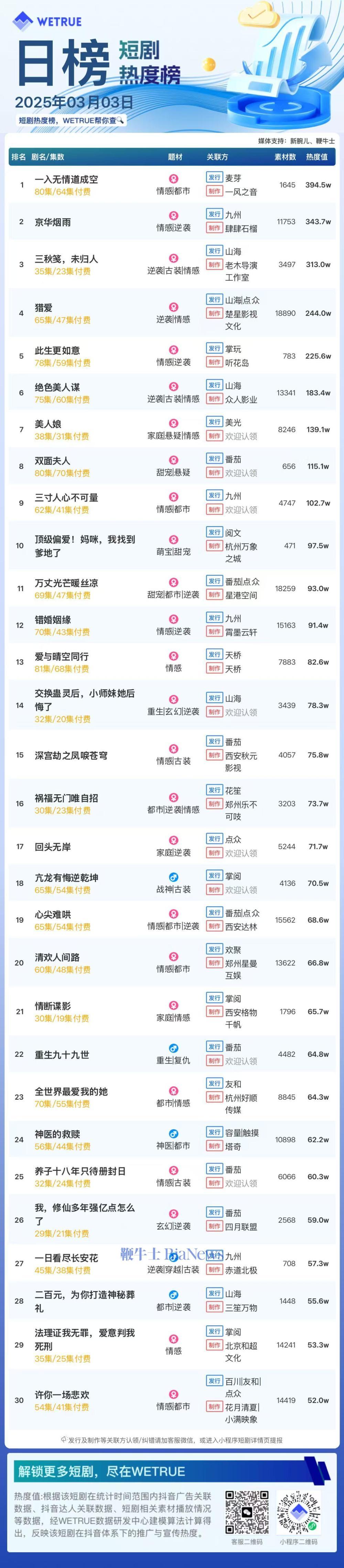 编者按:为帮助短剧从业者提供更多信息,专注于短剧报道的新腕儿和科技媒体鞭牛士联合WETRUE短剧热度榜共同推出短剧热度榜。