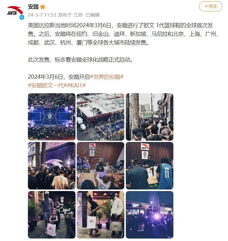 去年3月,与NBA知名球星欧文签约的安踏,携“欧文一代”签名系列球鞋(即ANTA KAI 1)亮相美国达拉斯,相继在纽约、旧金山、迪拜、新加坡和马尼拉等全球13个城市的潮流精品鞋店发售。