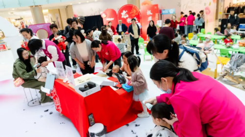 在万达广场、龙湖天街等全国大型商业体中庭,孩子王打造了可以沉浸式体验的“龙腾市集”,以蛇年元素与龙文化符号融合设计,呈现非遗与民俗交织的文化盛宴。市集内设“萌宝状元理发区”“非遗春耕体验角”“祥龙手作工坊”等板块。