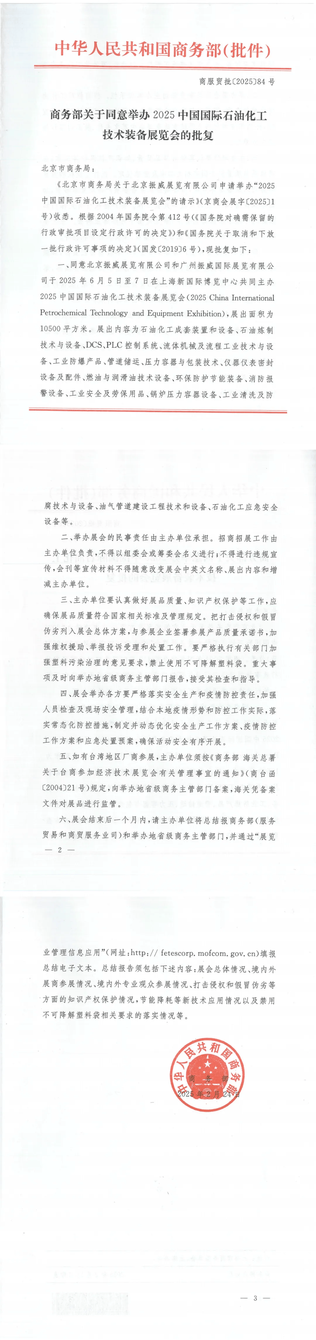 日前,中华人民共和国商务部发布《中华人民共和国商务部关于同意举办2025中国国际石油化工技术装备博览会的批复》文件。