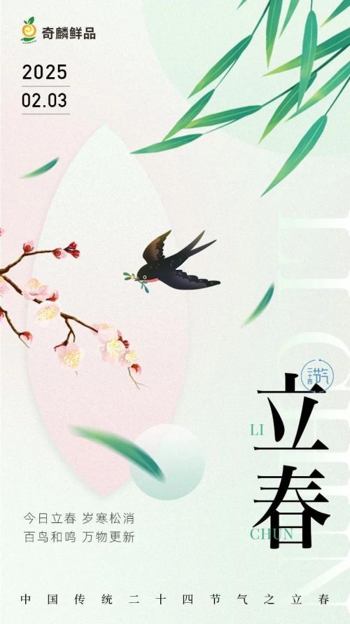 奇麟鲜品的节气节日海报,设计独具匠心。每一张海报都巧妙地将公司文化与节气特色、传统文化元素相融合。比如立春海报,画面中是鲜嫩的春芽,搭配着象征春天万物复苏的传统剪纸风格图案,色彩清新明快,文字部分则引用了关于立春的古文,寥寥数语,便将立春的氛围与团队的活力展现得淋漓尽致。