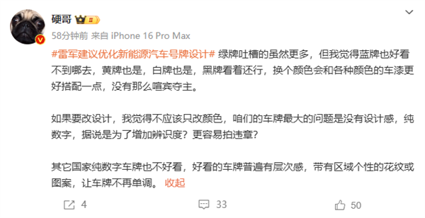 雷军建议优化新能源汽车号牌设计,随后,相关话题登上热搜,引发业内人士讨论与网友热议。
