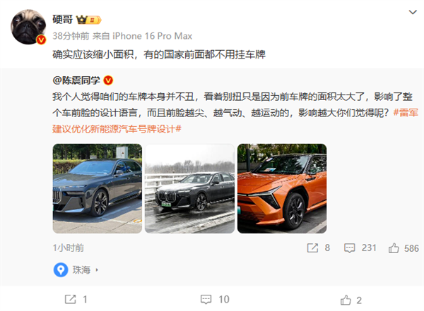 汽车博主陈震也参与到该话题的讨论,陈震表示:“我个人觉得咱们的车牌本身并不丑,看着别扭只是因为前车牌的面积太大了,影响了整个车前脸的设计语言,而且前脸越尖、越气动、越运动的,影响越大。”