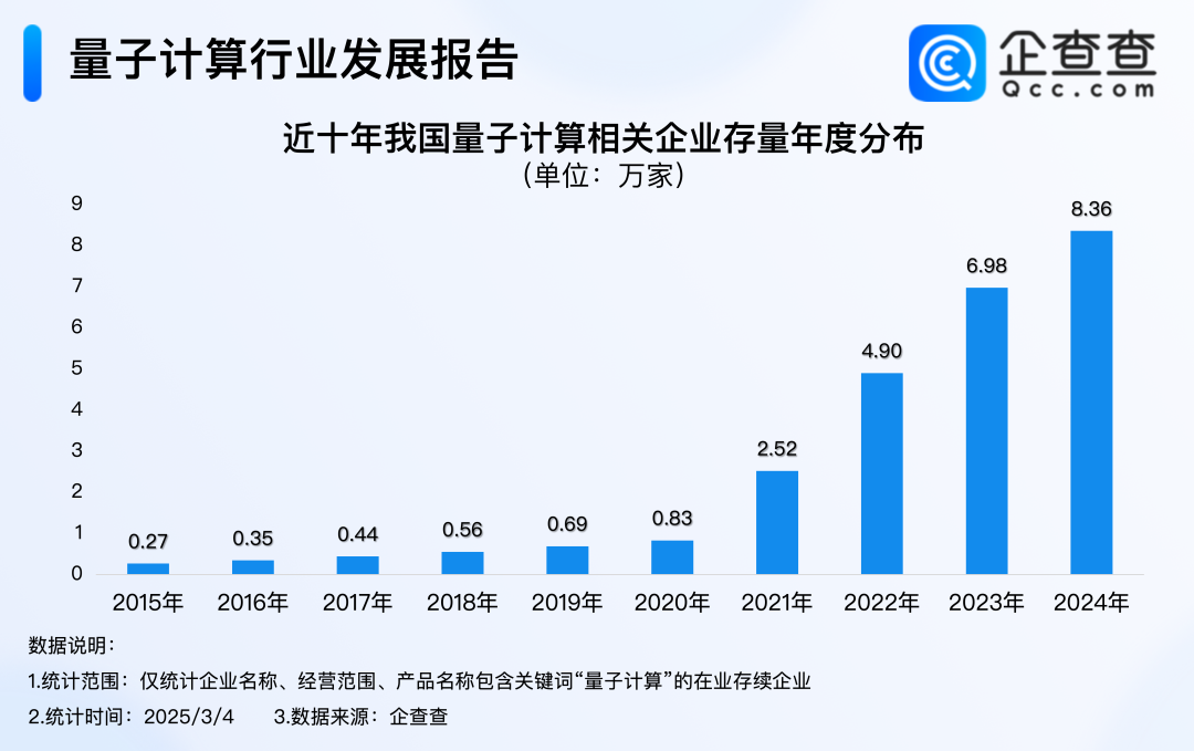 数据显示,我国量子计算相关企业存量从2015年末的0.27万家逐年稳定增加,至2020年末达0.83万家;2021年开始,我国量子计算相关企业存量进入快速增加阶段,并分别于2021年、2023年突破2万家、5万家;截至2025年3月4日,我国现存8.56万家量子计算相关企业。