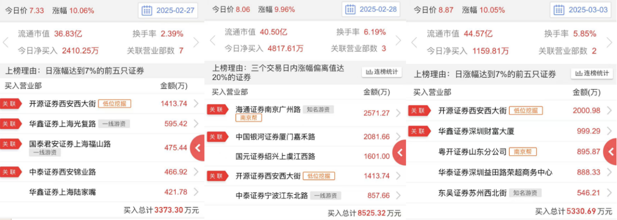 从近日收盘后的龙虎榜来看,包括低位挖掘(开源证券西安西大街)、南京帮(海通证券南京广州路)等多路游资均买入了天正电气的股票。其中,开源证券西安西大街营业部连续3日买入该股,体现出游资对其较为看好。