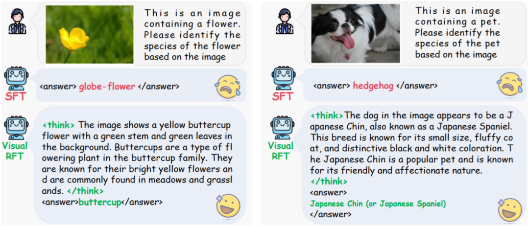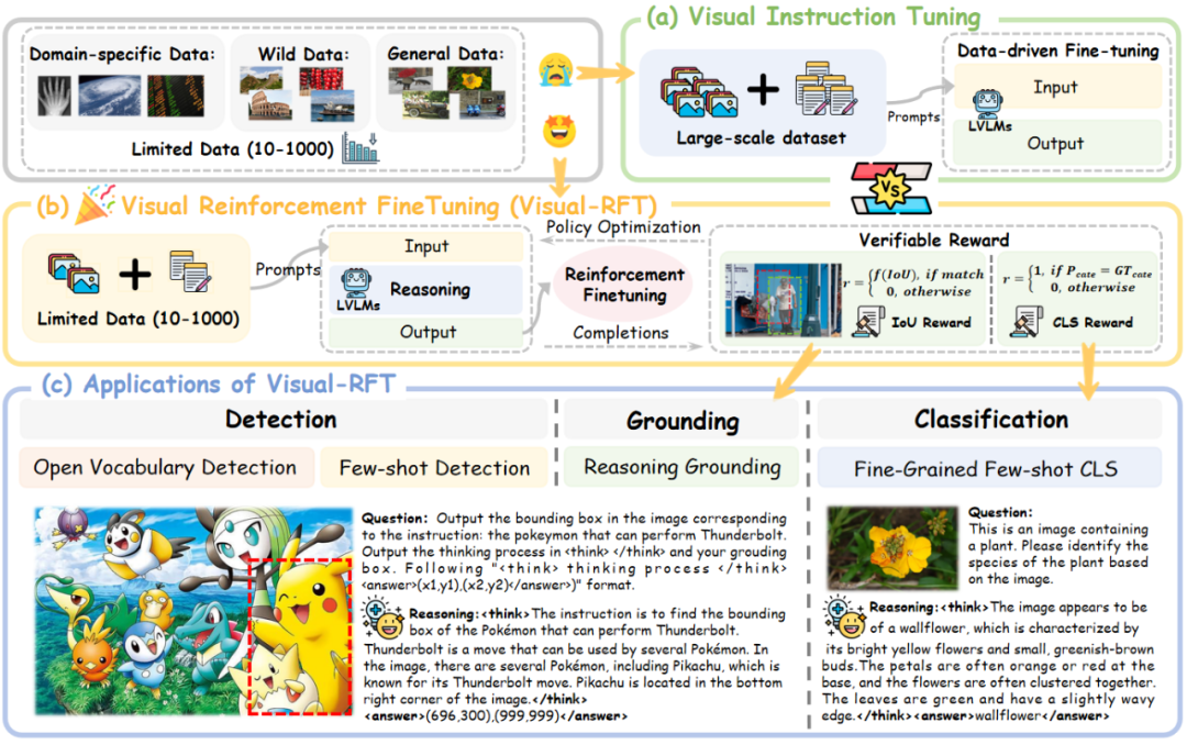 图 1. Visual-RFT 首次实现将强化微调能力迁移到多模态模型中,只需 10~1000 条数据就能通过思考过程和基于规则的监督提升多模态大模型的性能