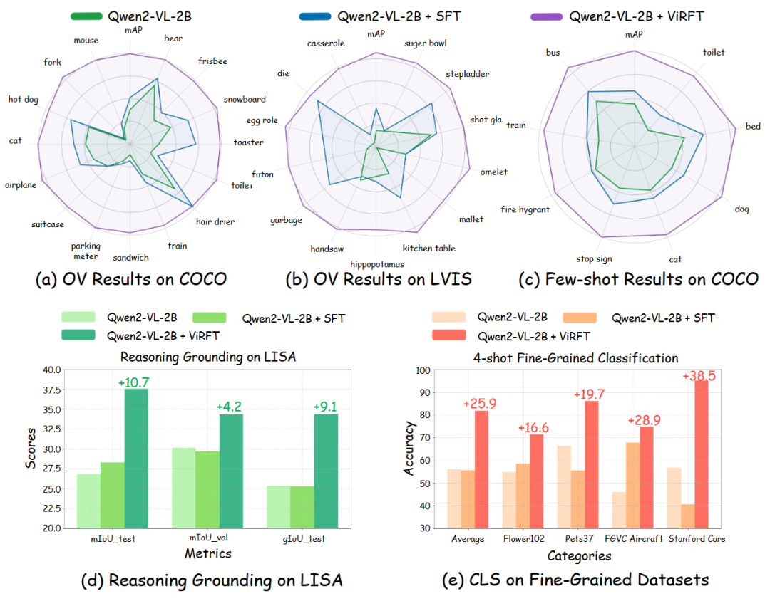 图 2. Visual-RFT(视觉强化微调)在各种任务上显著超越 SFT:包括目标检测(OD),开放目标检测(OVD),少样本检测与分类(FSOD/IC), 推理定位(Reasoning Grounding)