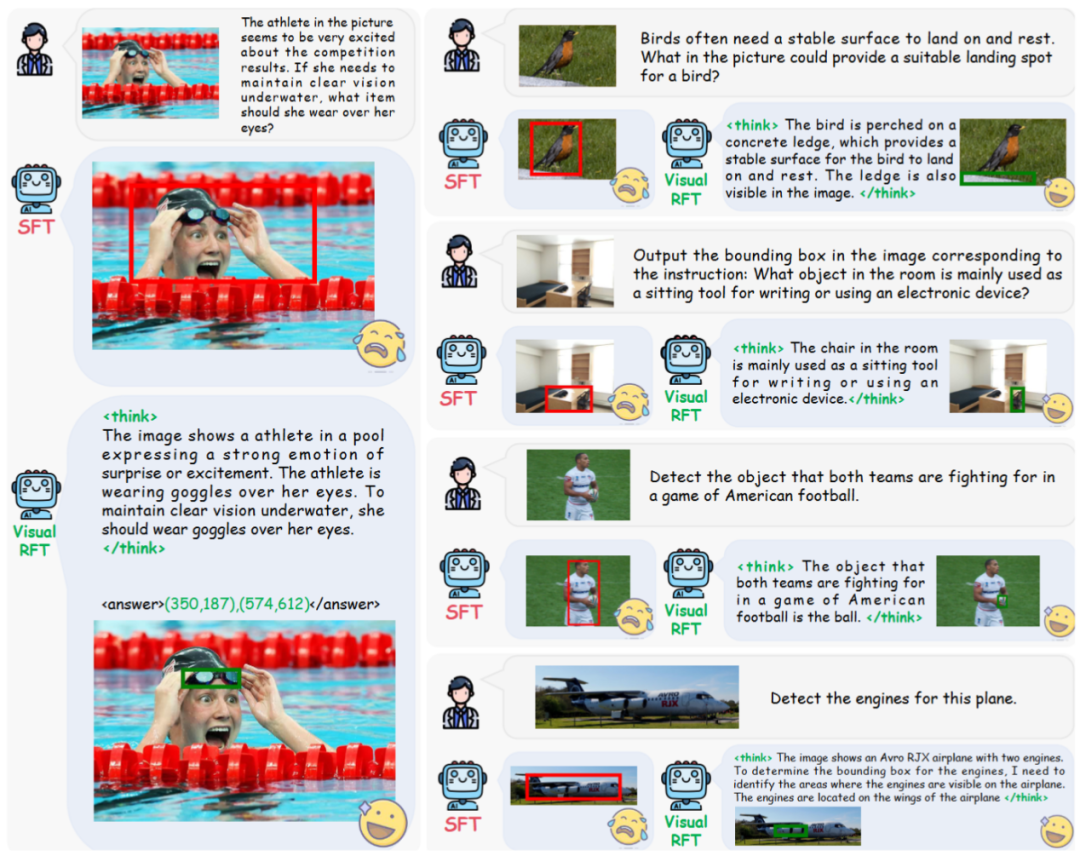 部分模型输出结果展示如图 4 和图 5 所示,相比于传统的视觉指令微调(Visual Instruction/Supervised Fine-Tuning),Visual-RFT(视觉强化微调)通过强化学习方法,对问题进行深入的 think 分析取得更佳推理性能,相较于传统的指令微调(SFT)方法取得显著提升。如询问模型图中的运动员在水下依然保持清晰的视野需要带什么物体时,通过传统指令微调的方法模型直接将整个运动员框出。而 Visual-RFT 通过引入推理过程准确地指出防水眼镜及其所在的位置并准确框出。