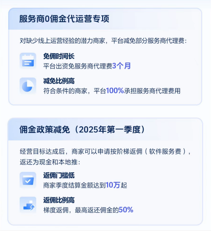 同时,为了降低中小商家经营成本,2024年第四季度,平台推出服务商0佣金代运营专项,累计为500多个中小商家免除服务商代理费用。2025年第一季度,专项追加预算投入,预计帮扶超3000个中小商家。此外,2024年平台推出中小商家佣金减免政策,累计为6000余个中小商家减免佣金,2025年第一季度该政策将延续。