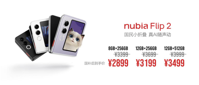 即日起,努比亚Flip 2将在中兴商城、京东、天猫、抖音、拼多多等全渠道正式开售。新机拥有雪钻白、星光黑、冰晶紫三种精致配色,内存提供8GB+256GB / 12GB+256GB / 12GB+512GB三种版本选择,售价3399元起,国补后到手价2899元起。