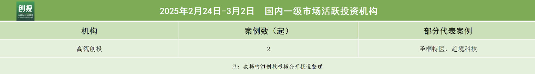 从机构投资活跃度来看,本周高瓴创投较为活跃,完成2笔融资,主要聚集在科技与制造和消费服务领域。