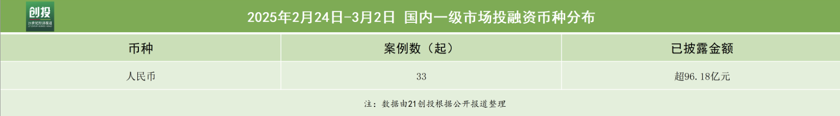 21创投不完全统计,2月24日—3月2日,报告日期内国内一级市场发生融资事件42起。其中,有33笔融资披露了融资金额和币种信息,总规模约合人民币96.18亿元。